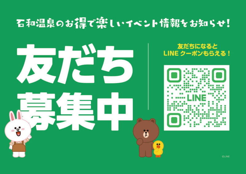 石和温泉旅館協同組合の公式LINEアカウントを友だち追加すると、大変お得なクーポンをプレゼント!この機会にぜひ友だち追加してクーポンをゲットしてください。